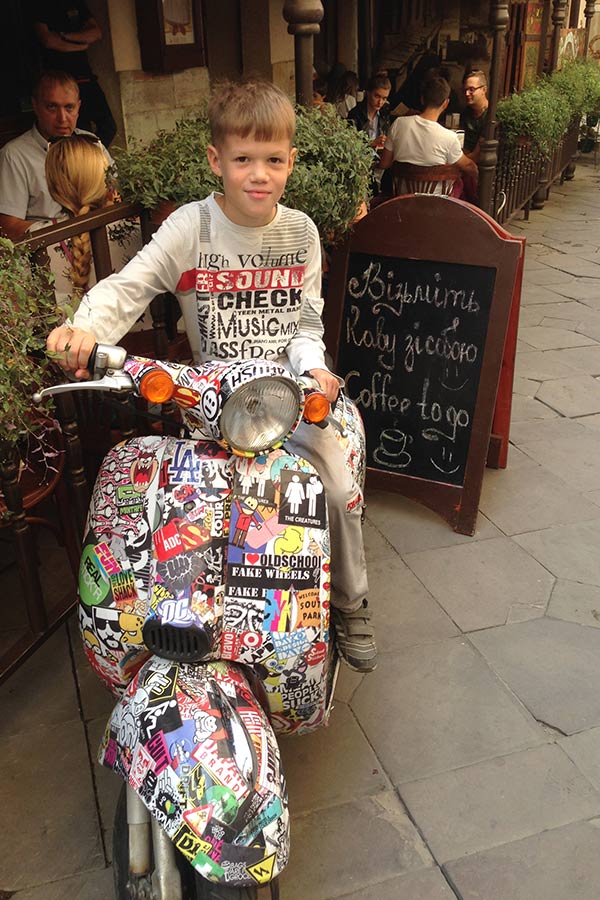 Цей мотоцикл знаходиться в кафе “На бамбетлі“, в пасажі Андріолі (площа Ринок, 29). Дарт Вейдер явно живе у Львові, кожен раз його зустрічаю.